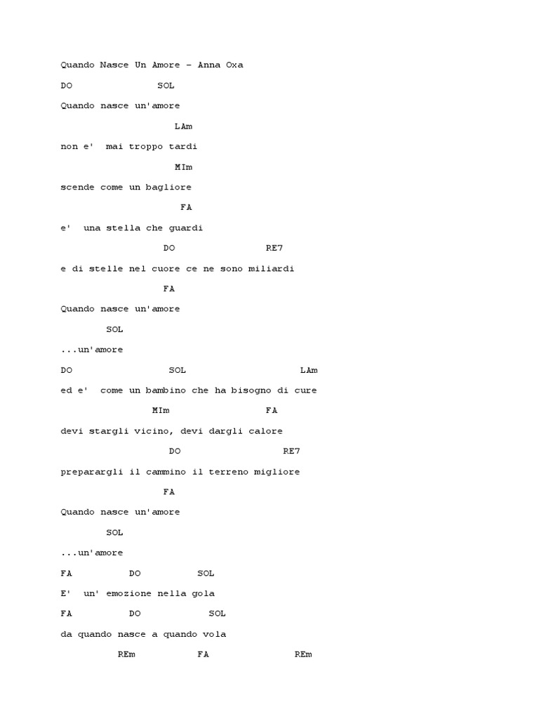 E un emozione nella gola da quando nasce a quando vola che cosa cè di più celeste di un cielo che ha vinto mille tempeste che cosa cè se adesso sento. Quando nasce un amore non è mai troppo tardi scende come un bagliore da una stella che guardi e di stelle nel cuore ce ne sono miliardi quando nasce un amore un amore. La FaLa Solm Fa6 Re LaRe Do7 Fa7 La FaLa Quando nasce un amore Solm non e mai troppo tardi Fa6 scende come un bagliore Re e una stella che guardi LaRe Do7 e di stelle. Quando nasce un amore è un brano musicale scritto da Franco Ciani Piero Cassano ed Adelio Cogliati 2 già autori di Eros Ramazzotti interpretato da Anna Oxa al Festival di Sanremo.